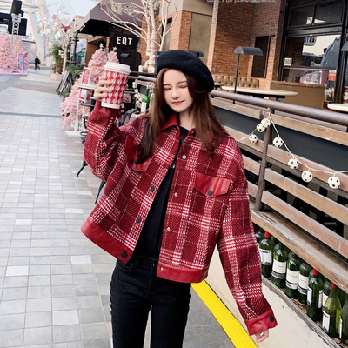 新款秋季裝流行港風(fēng)短款外套女格子復(fù)古春季學(xué)生寬松百搭?yuàn)A克