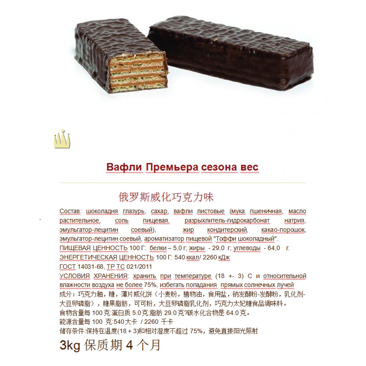 Вафли, глазированные шоколадной глазурью. Состоят из трёх слоёв вафель и трёх слоёв начинки.