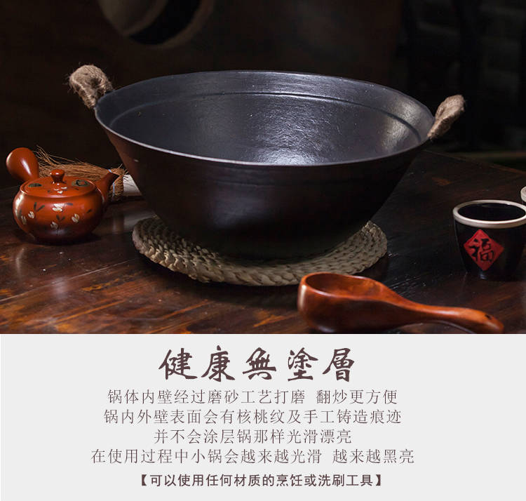 傳統(tǒng)雙耳鑄鐵鍋炒菜鍋老式鐵鍋圓底家用無涂層不粘鍋燃氣灶生鐵鍋