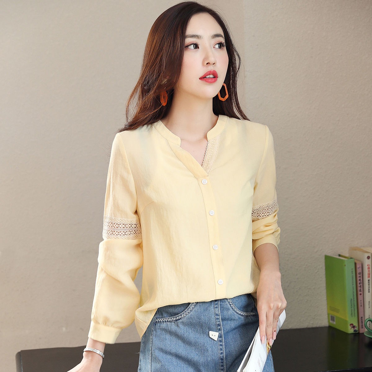 2020年春季新品女款韓版時尚百搭甜美拼接花邊V領襯衫