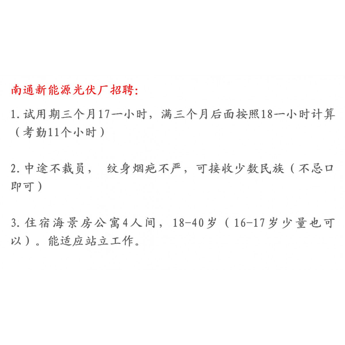 3.住宿海景房公寓4人間,18-40歲(16-17歲少量也可以)。能適應(yīng)站立工作。