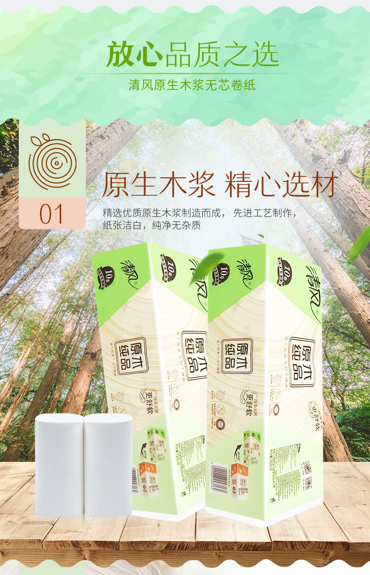 清風無芯卷紙原木10卷30卷實心衛(wèi)生紙批發(fā)家用卷筒紙家用廁紙紙巾