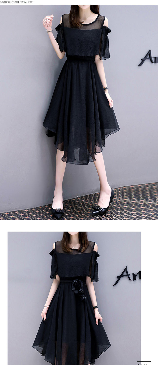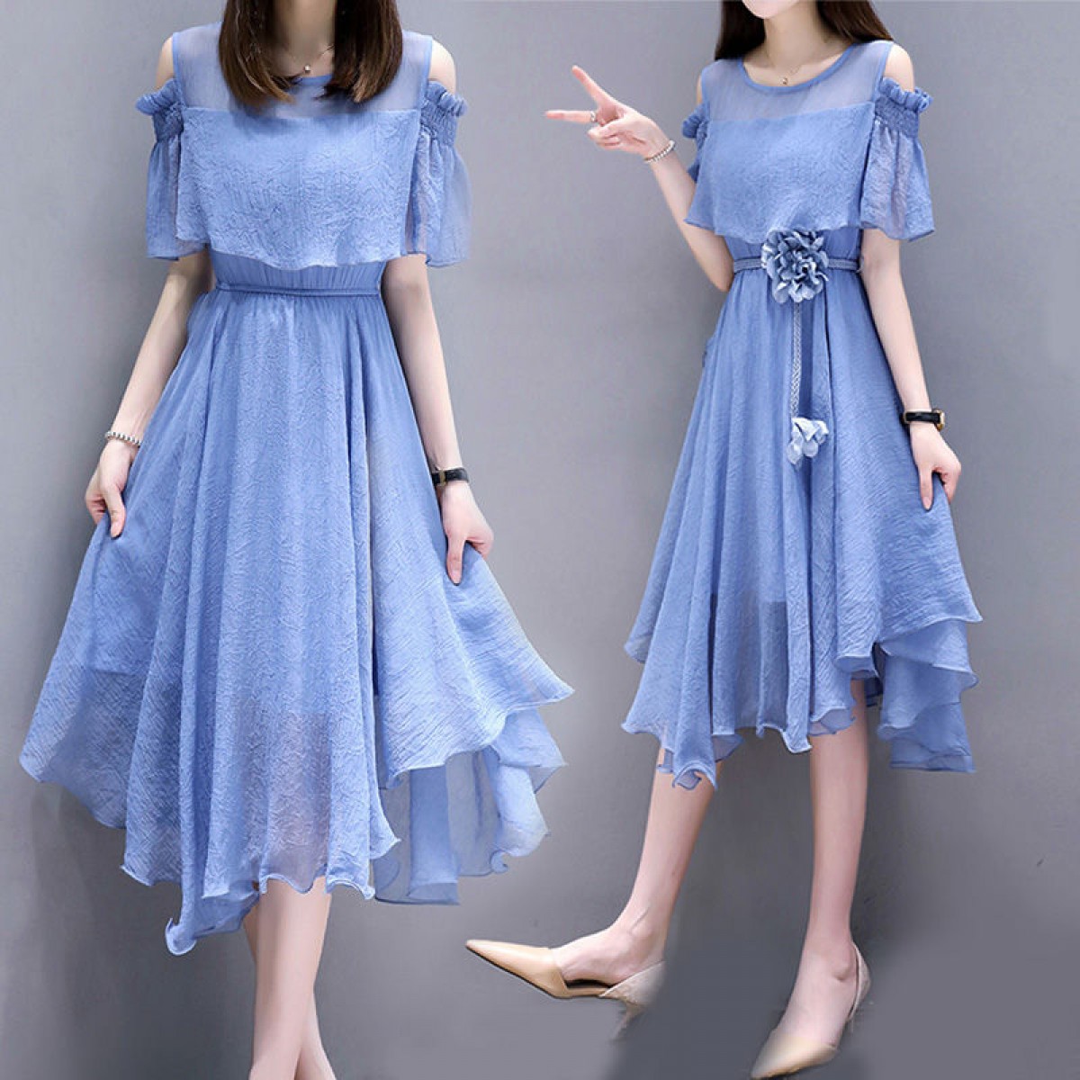 送同款腰帶 雪紡連衣裙2020夏裝仙女甜美顯瘦夏季中長(zhǎng)款露肩裙子
