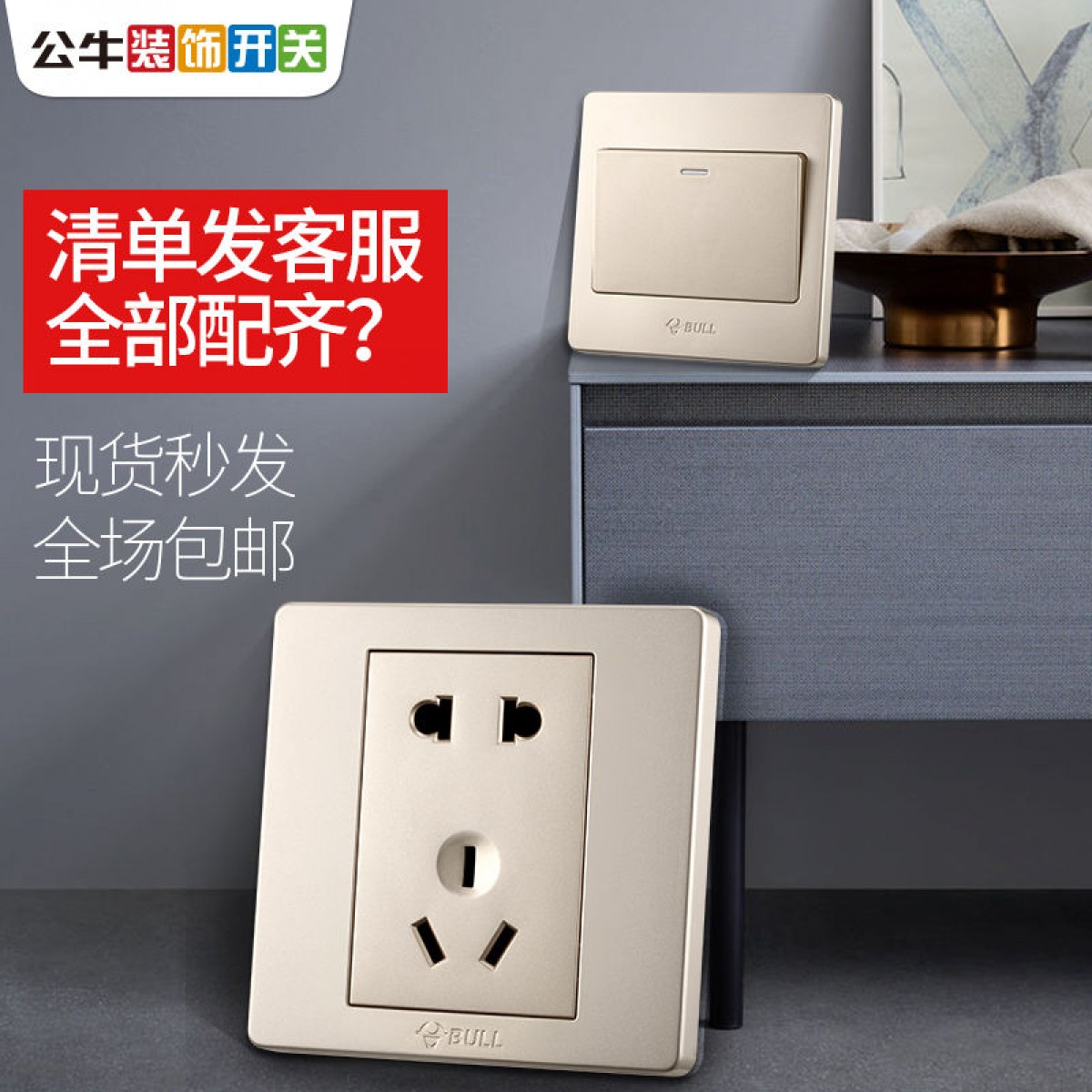 公牛開關(guān)插座面板家用香檳金開關(guān)墻壁式86型正品暗裝帶5五孔多孔